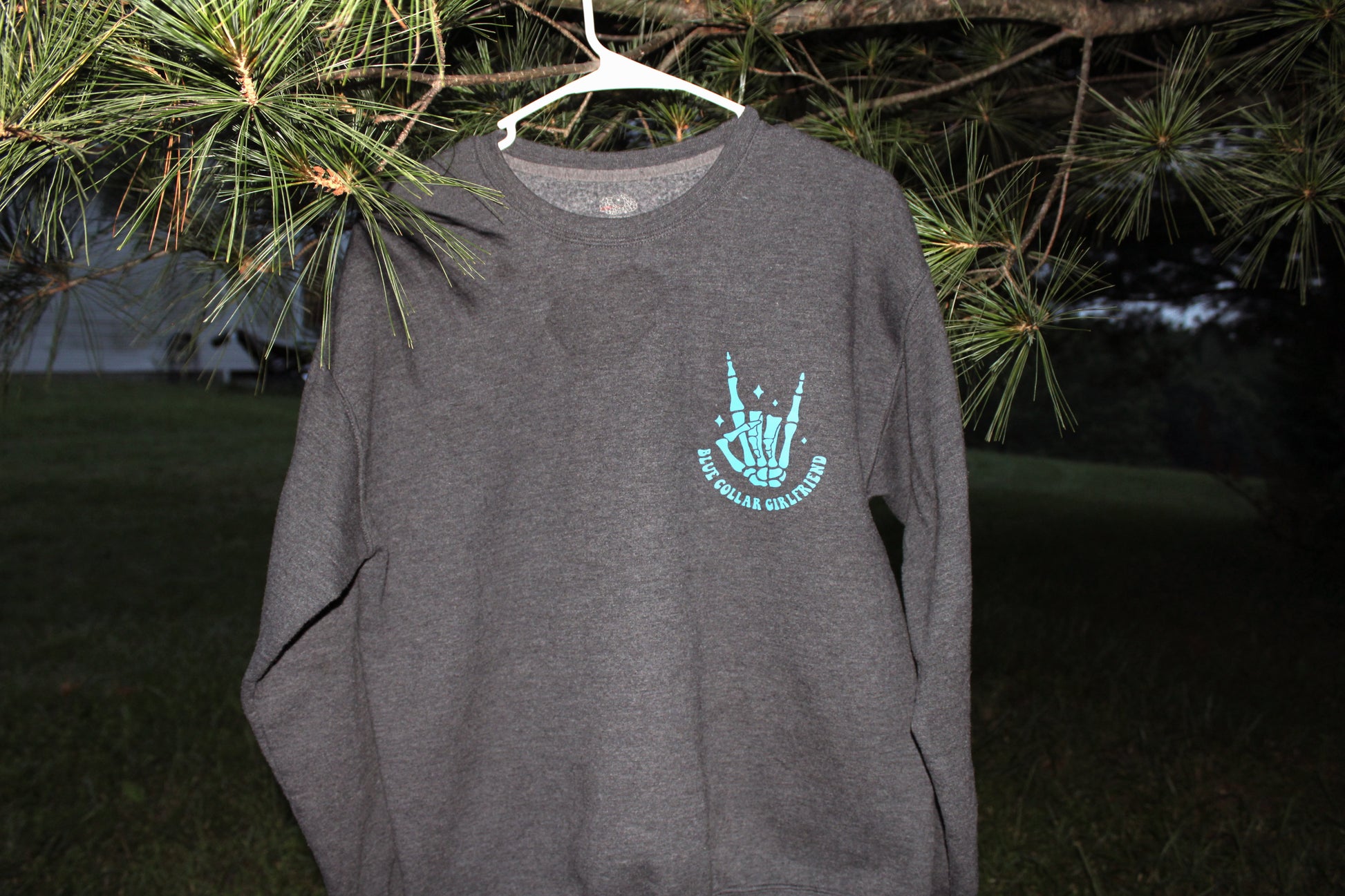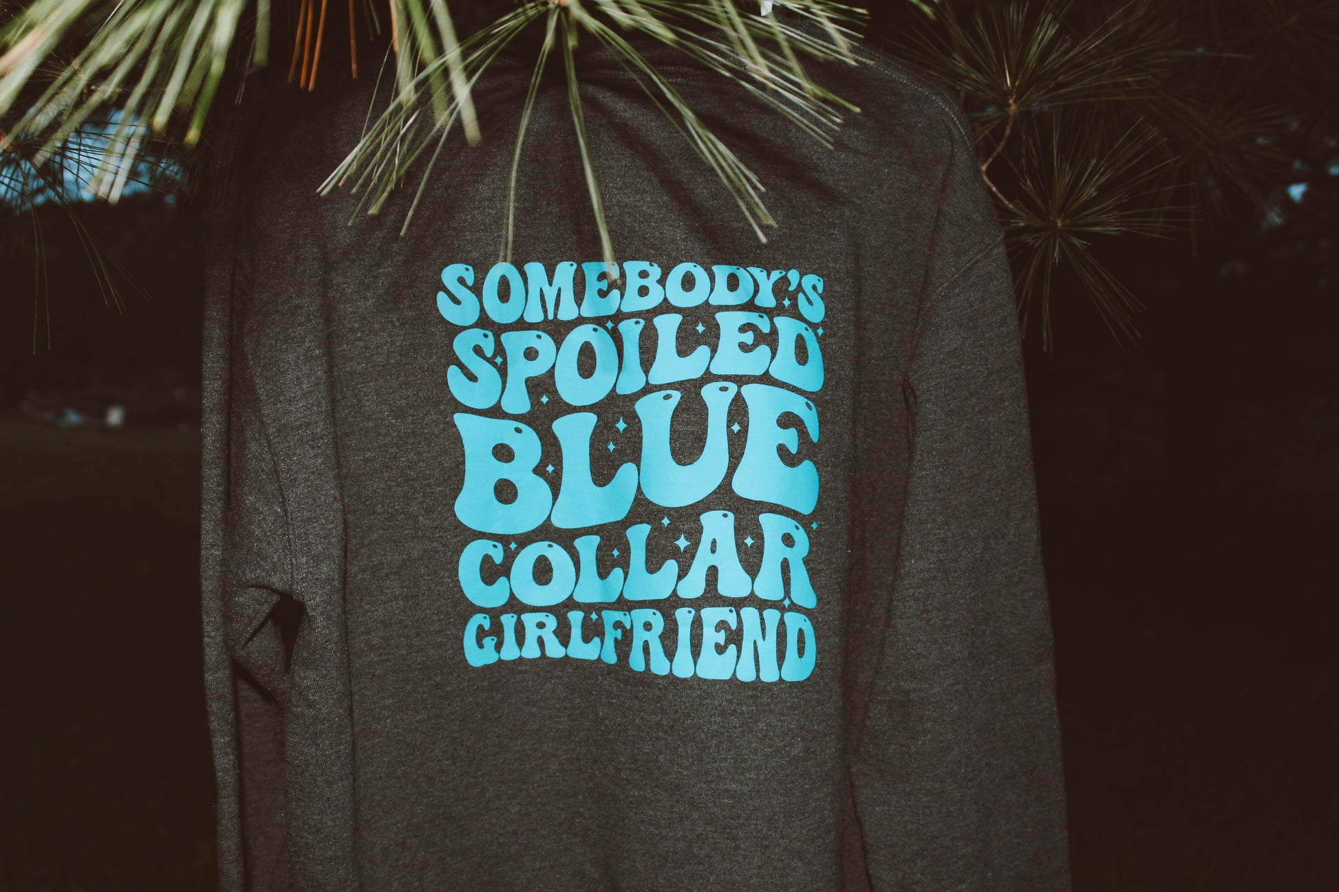 Show off your hardworking love with a bold, playful twist! Our "Somebody’s Spoiled Blue Collar Girlfriend" sweatshirt is for the proud babes who love their blue-collar guys—and aren’t afraid to say it. Featuring bright retro-inspired lettering on a soft, charcoal gray crewneck, this cozy piece is just as durable as your man’s work boots but way cuter.